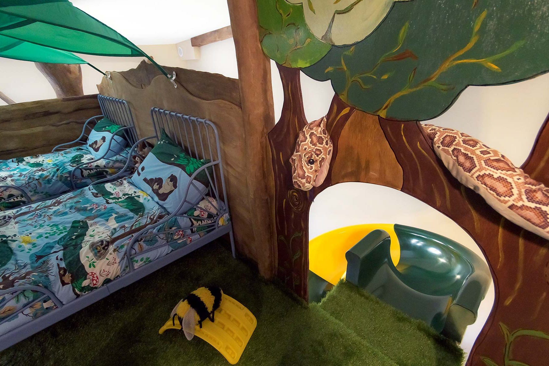 Diseñado para 2 adultos y hasta 3 peques, cuenta con una habitación doble y un espacio infantil lleno de detalles mágicos: camas a medida, zona de juegos con columpio y, cómo no, un tobogán interior que hará las delicias de los más pequeños.
